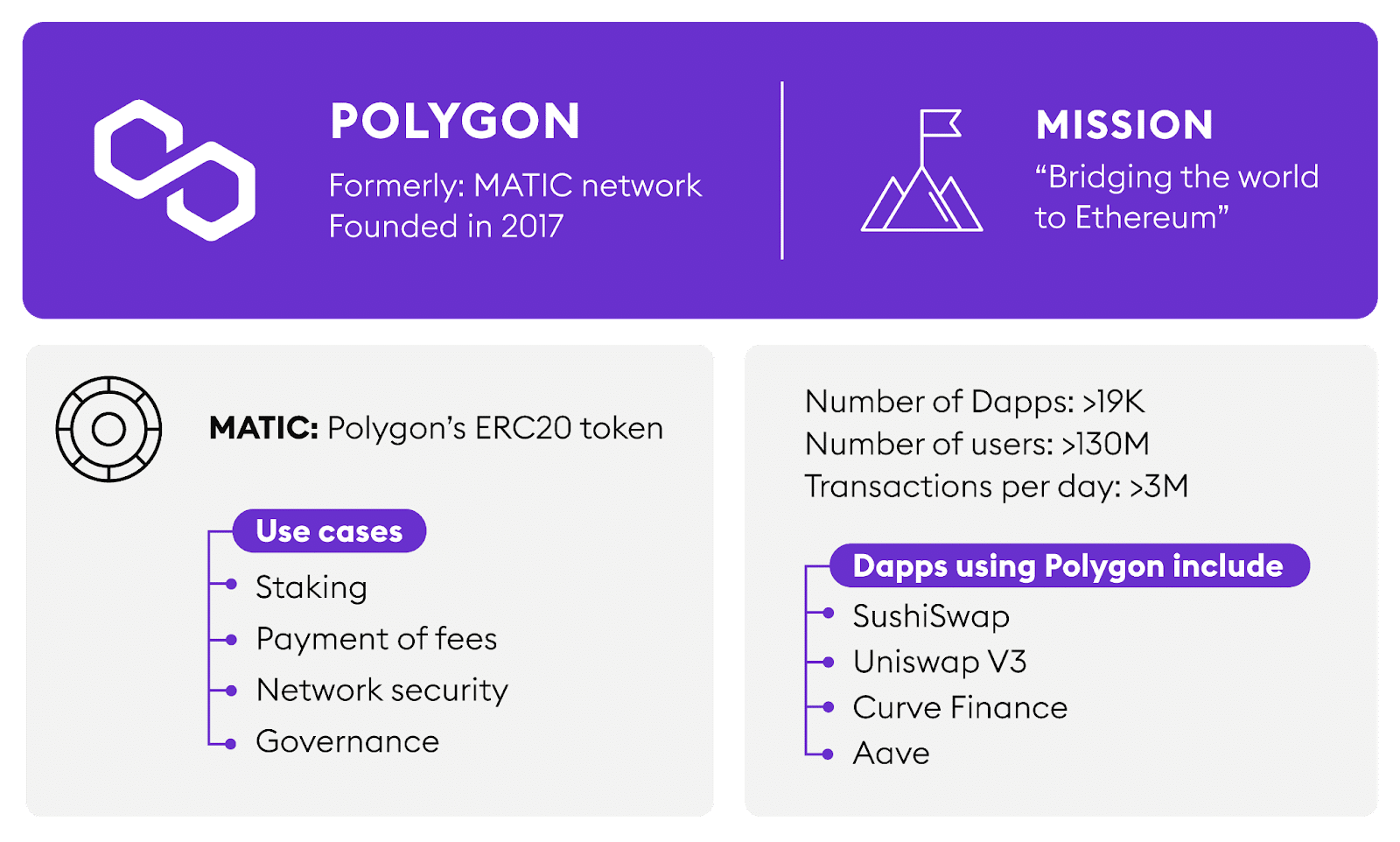 Polygon is the first user-friendly platform for Ethereum (ETH) scaling and infrastructure development. In simple terms, Polygon enables the Ethereum blockchain to function as a fully-fledged multi-chain network similar to Polkadot.