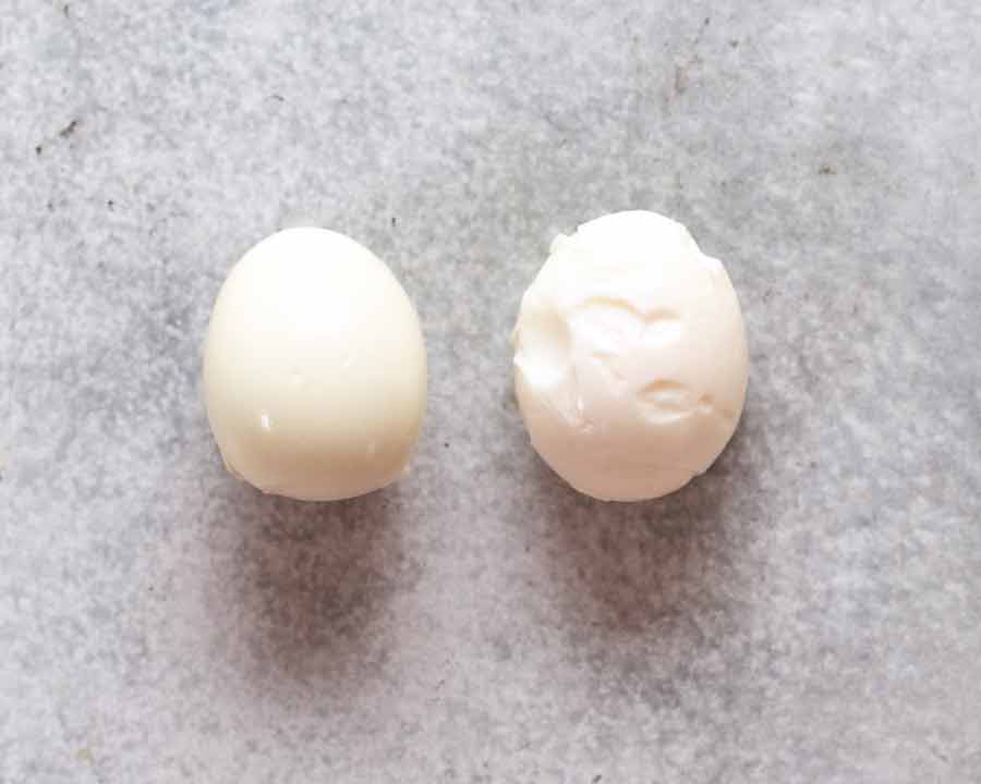 As for the burning question of why some eggs peel neatly while others end up with a textured surface like the moon's craters, there is a vast amount of information available! The only certainty is that older eggs are generally easier to peel, as the membrane of freshly laid eggs adheres more firmly to the shell. The membrane degrades over time, making it easier to peel. I find that eggs purchased from the store and refrigerated for a week usually peel neatly.